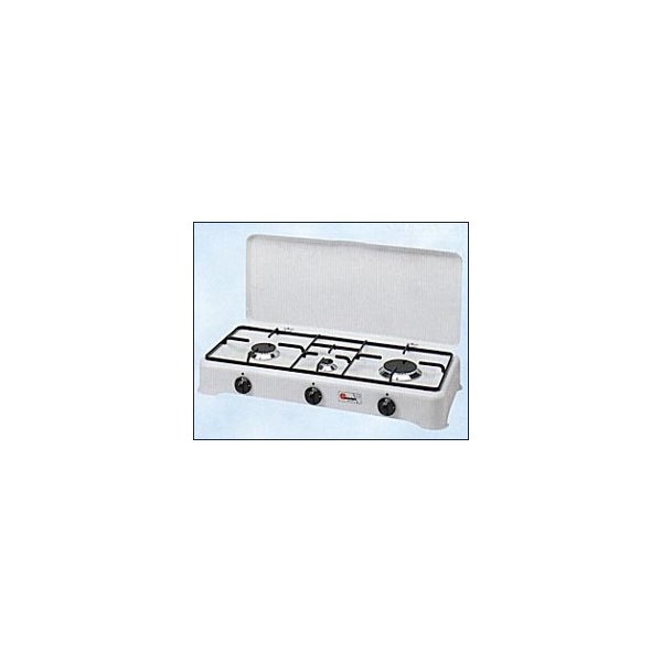 Fornello a gas 3 fuochi, bruciatori in lega Pyral N2 spartifiamma smaltati, griglia in acciaio smaltato.