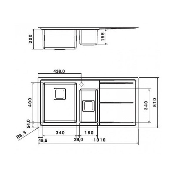 - 1 vasca 340x400mm e 1 vasca 180x340mm con gocciolatoio a sinistra;