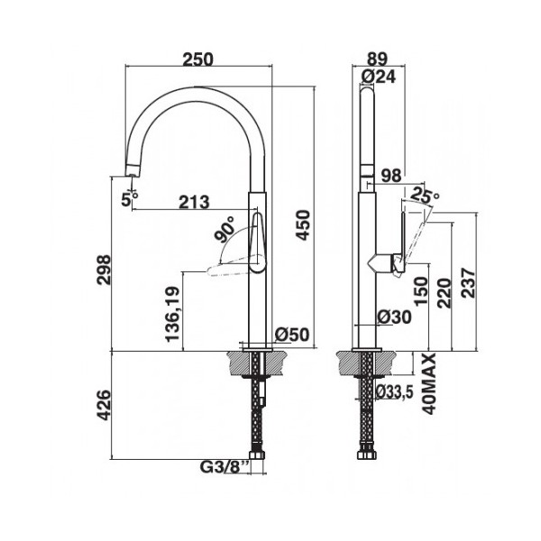 Altezza (max): 45 cm, Altezza sopra la superficie di fissaggio (max): 29,8 cm, Lunghezza tubo: 0,426m. Larghezza imballo: 80 cm, Profondità imballo: 32,5 cm, Altezza imballo: 8,5 cm