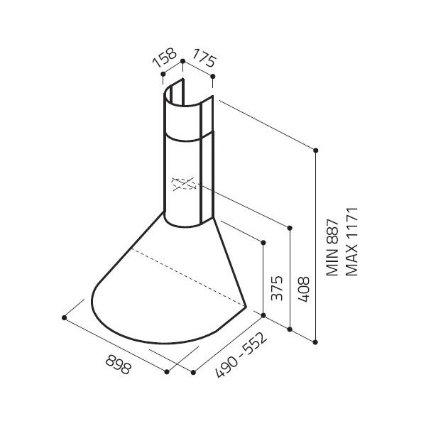 Elica TONDA IX F/90. Tipo di estrazione: Filtrante, Potenza massima di estrazione: 400 m³/h, Rumorosità (velocità bassa): 47 dBi. Modello: Montabile a parete, Tipo di lampada: Alogena, Colore del prodotto: Acciaio inossidabile. Tipo di filtro grasso: Alluminio. Carico di collegamento: 226W, Potenza motore: 170W, Potenza lampada: 28W. Larghezza: 89,8 cm, Profondità: 55,2 cm, Altezza: 88,7 cm